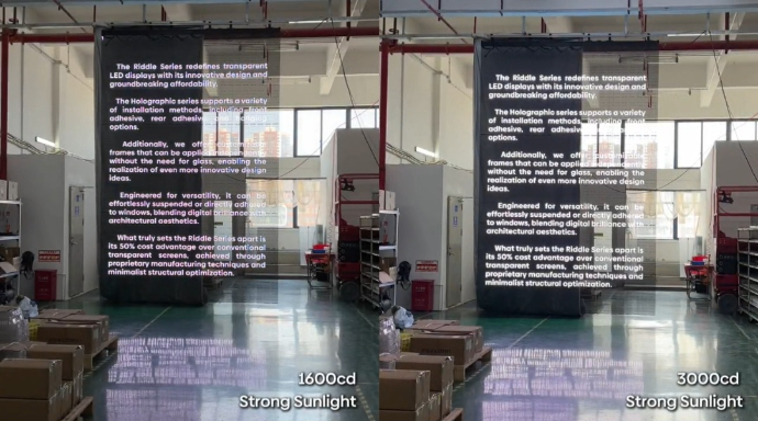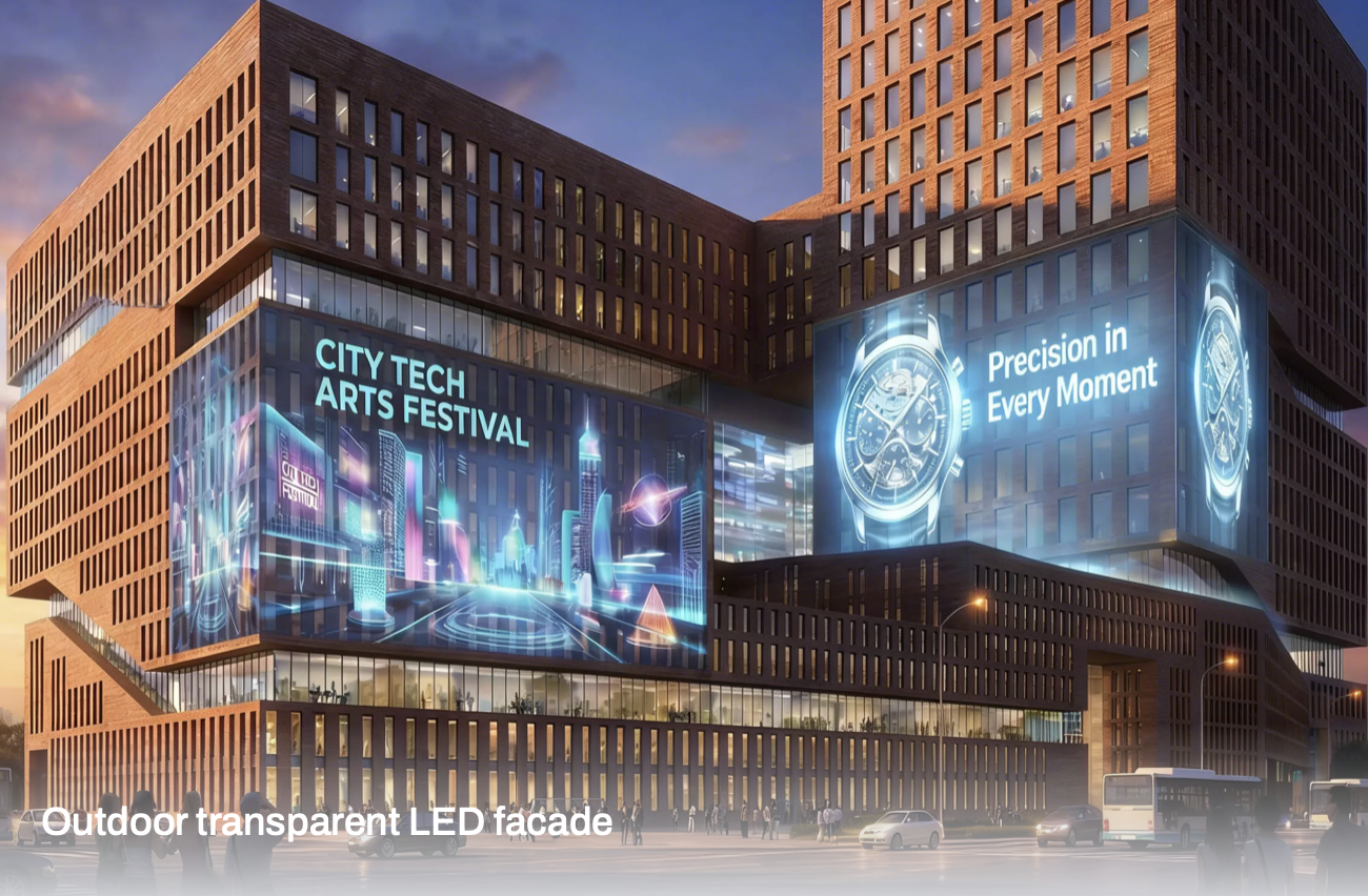 Das natürliche Tageslicht bleibt erhalten, während gleichzeitig dynamische Inhalte wie Videos, Animationen oder Werbebotschaften dargestellt werden können.